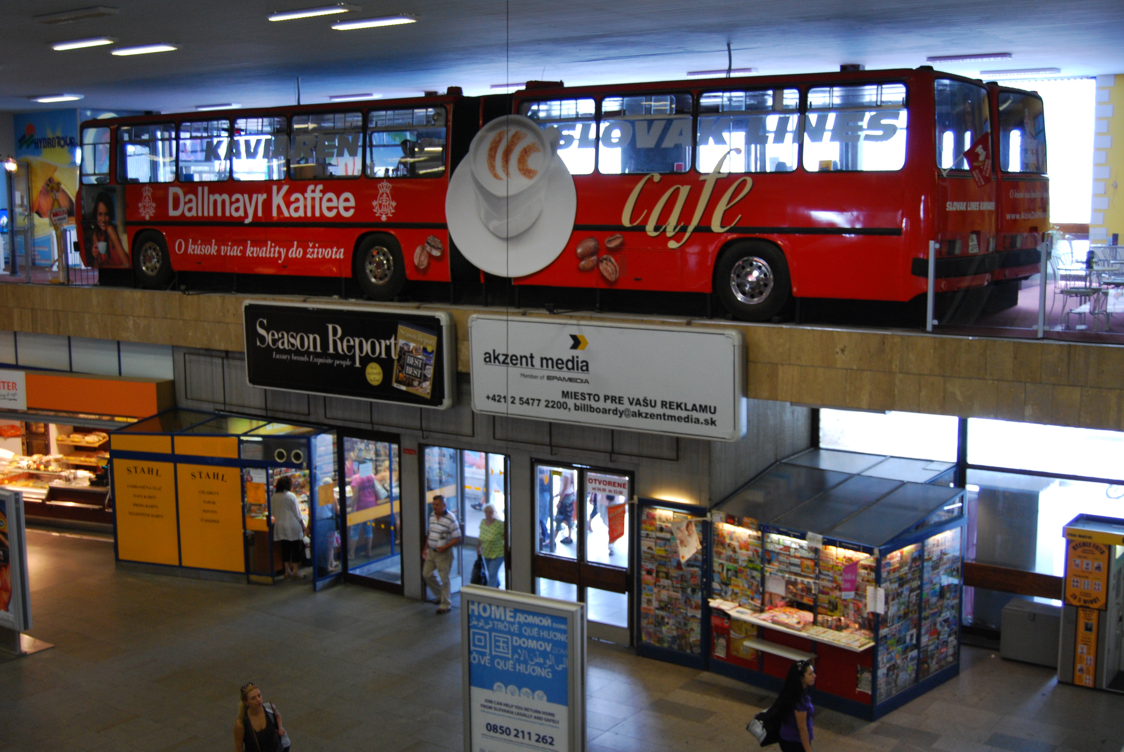 Yes, there is a fake bus in the bus station. Like many buses in Slovakia the air conditioner appears to be out of order, but unlike all buses in Slovakia, this one serves coffee and other beverages!
