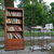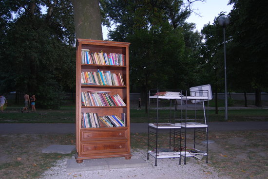 Tied to a tree next to the lounge is a shelf of books.