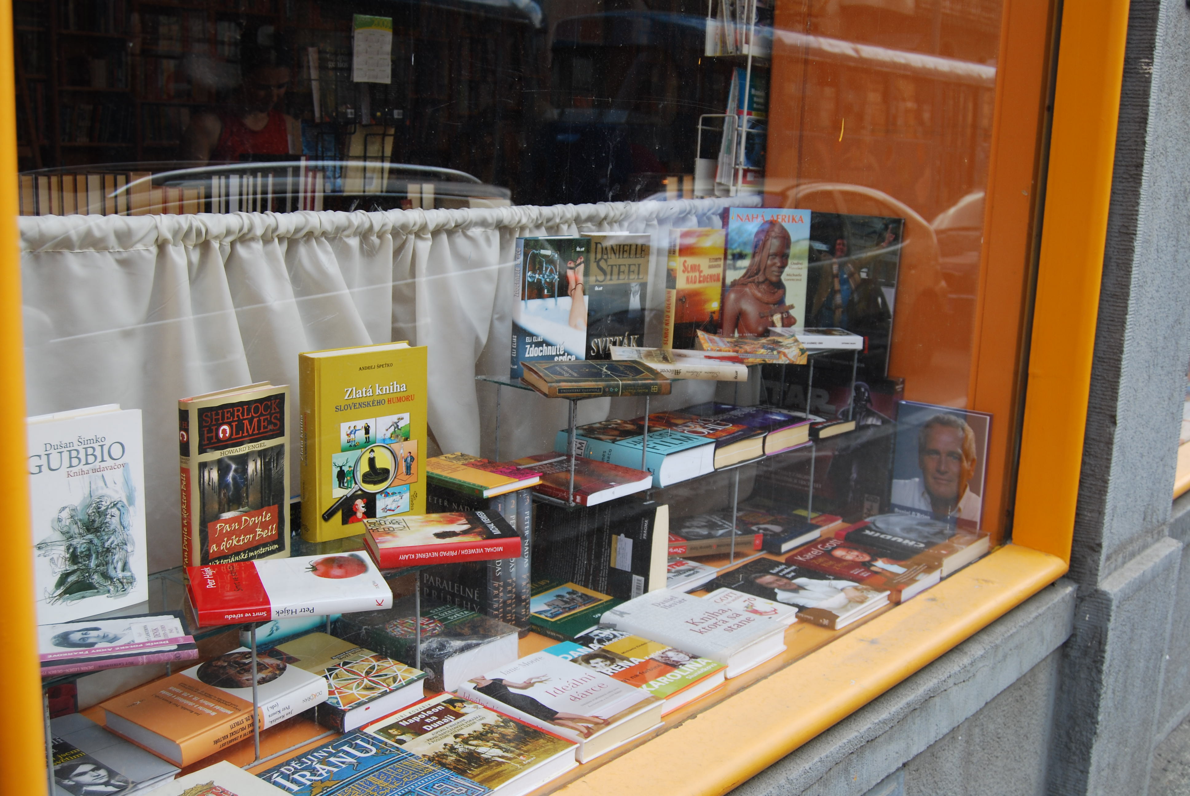 A lovely lace curtain and an oddly disorganized pile of books behind glass. Homey?